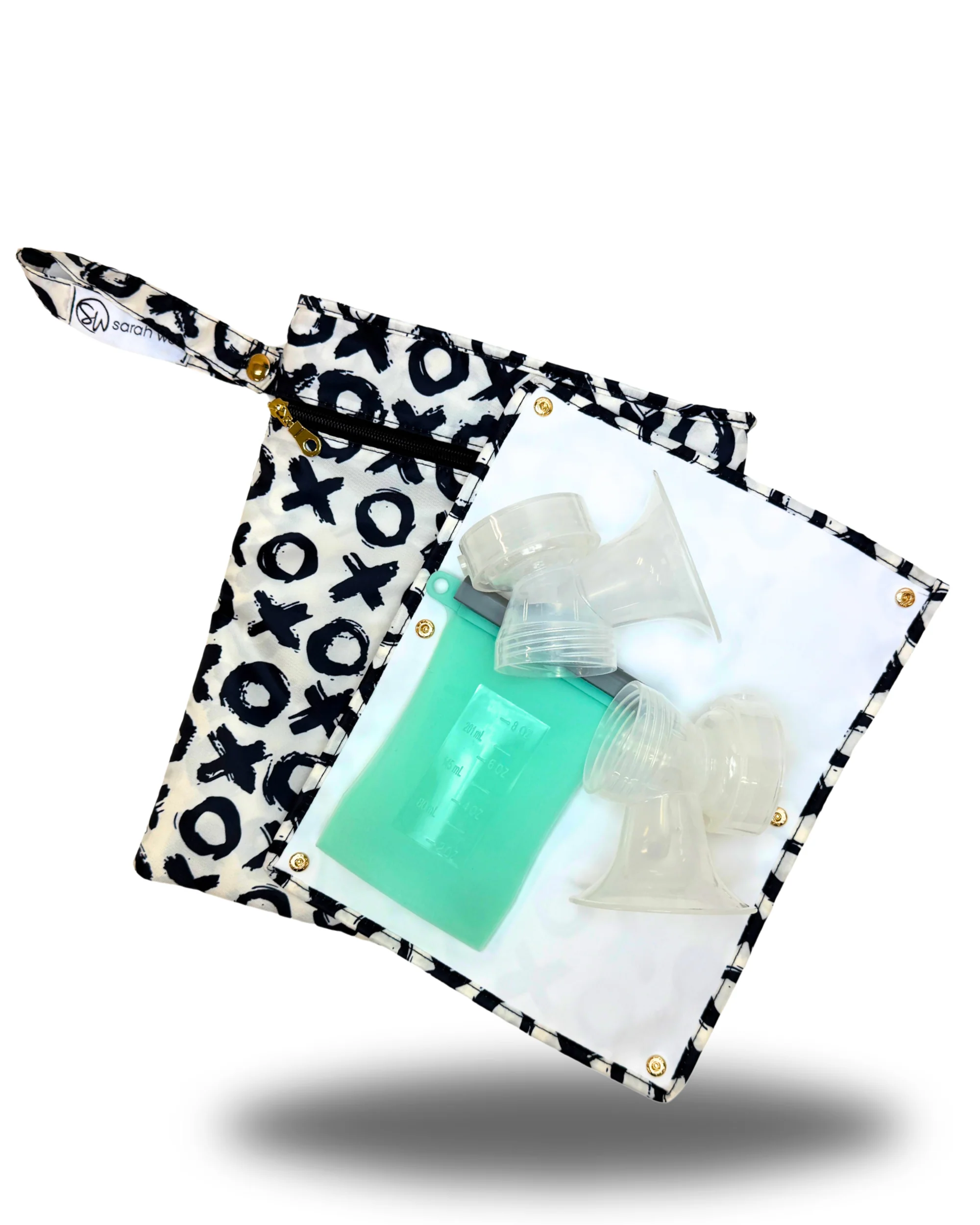 The "Pumparoo," is the ORIGINAL breast pump parts wet/dry bag + staging mat from Sarah Wells, who offers the top breast pump bag designs on the market. This wet/dry bag + ALL NEW "staging mat" design serves as a transport pouch for flanges, bottles, bags and more and also serves as a clean space to setup/take down your breast pump parts. * BPA-free * PVC-free * Phthalate-free * Lead-free zippers Bonus features: The wrist strap will go all the way around your wet/dry bag if you fold the bag into quarters. Carry it compactly! Use the front (smaller) zip compartment for dry items and the main (larger) zip compartment for wet items (waterproof). Lots of other uses for the wet/dry bag: diapers, swim suit, snacks, messy clothes! Machine washable!